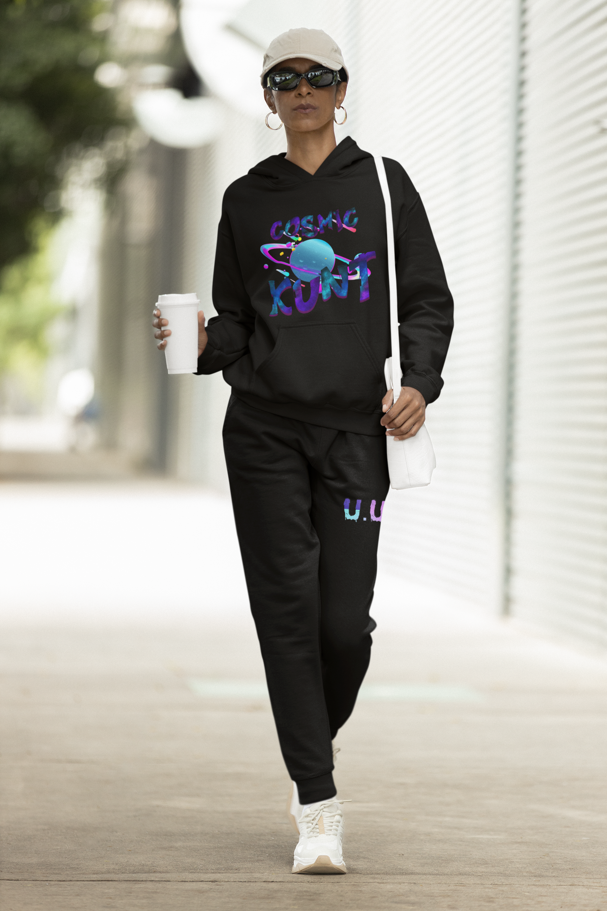 Unleash your individuality with the Cosmic Kunt Sweat Suit from Uniquely Unidentified! Enjoy ultimate comfort with our heavyweight (7.0 oz) hoodie, crafted from soft fabric (52% Airlume combed and ring-spun cotton, 48% polyester fleece, 32 single). The 6.5 oz pants, made from 52% combed and ring-spun cotton and 48% polyester fleece, have side pockets, a white cord drawstring, side seams, and cuffed bottom for a perfect fit. Stand out with our made-to-order gear. Celebrate your persona with Uniquely Unidentified!